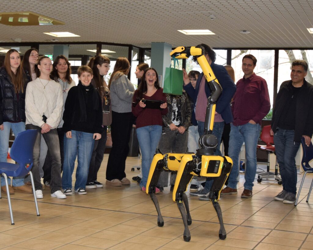 Die Schülerinnen bekamen Einblicke in die Automatisierungstechnik bei Herrn Kronenburg, bauten eine Leonardo Brücke über einen gefährlichen Fluss bei Herrn Ghodstinat, gravierten Einkaufswagenchips bei Herrn Wambach und steuerten unseren Roboterhund Spoty zusammen mit Herrn Krawczyk. Organisiert wurde dieser Besuch von Herrn Reinemer.